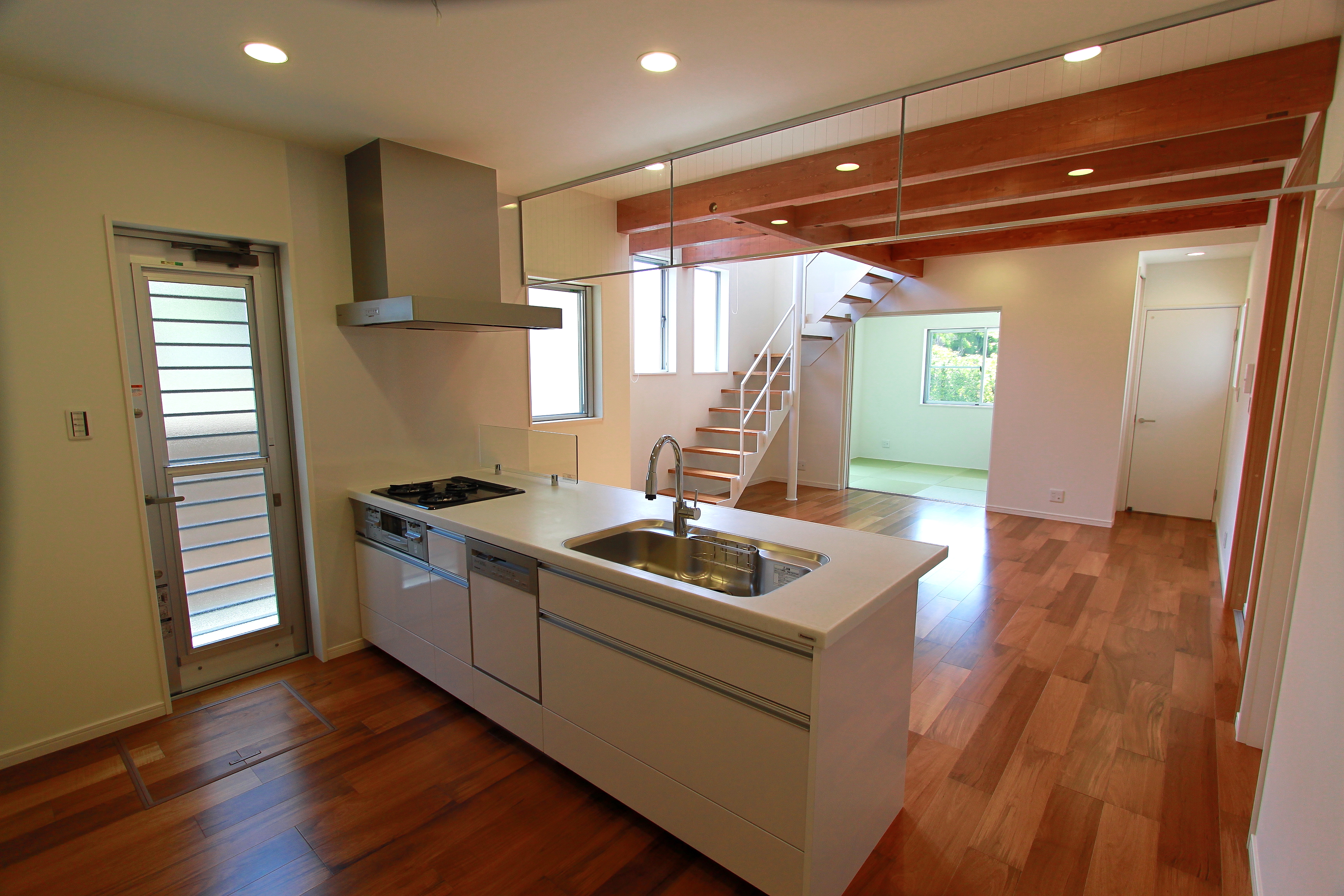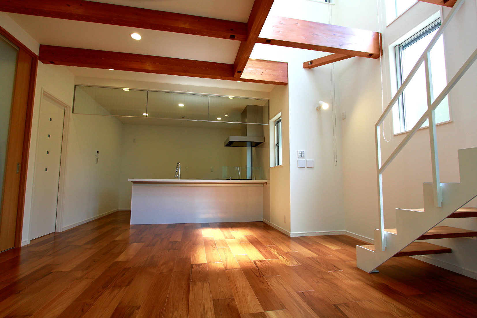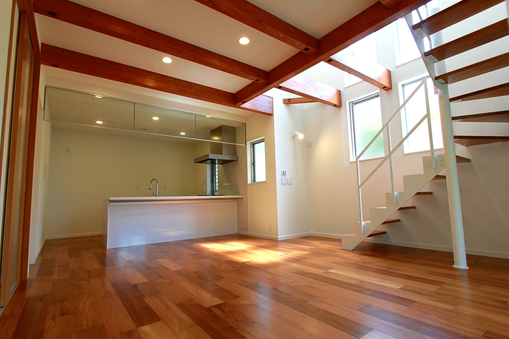 | 床は、全室 チーク材 幅広 銘木フロアー(天然木の突き板) 和室と隣接した18帖のLDKは 吹抜け&化粧梁を採用 |