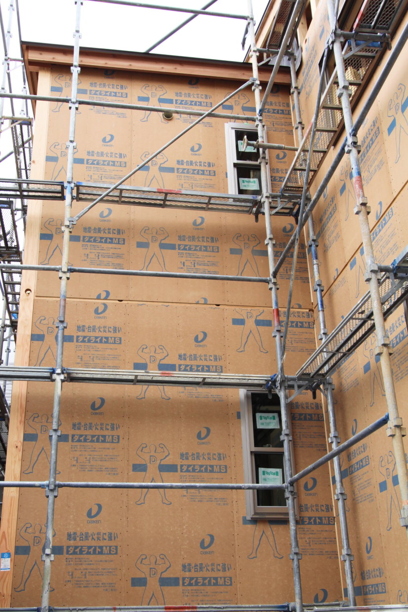 | 耐震性を高めるため、外壁に高強度・恒久性の壁面材ダイライトを貼りました | |||||||