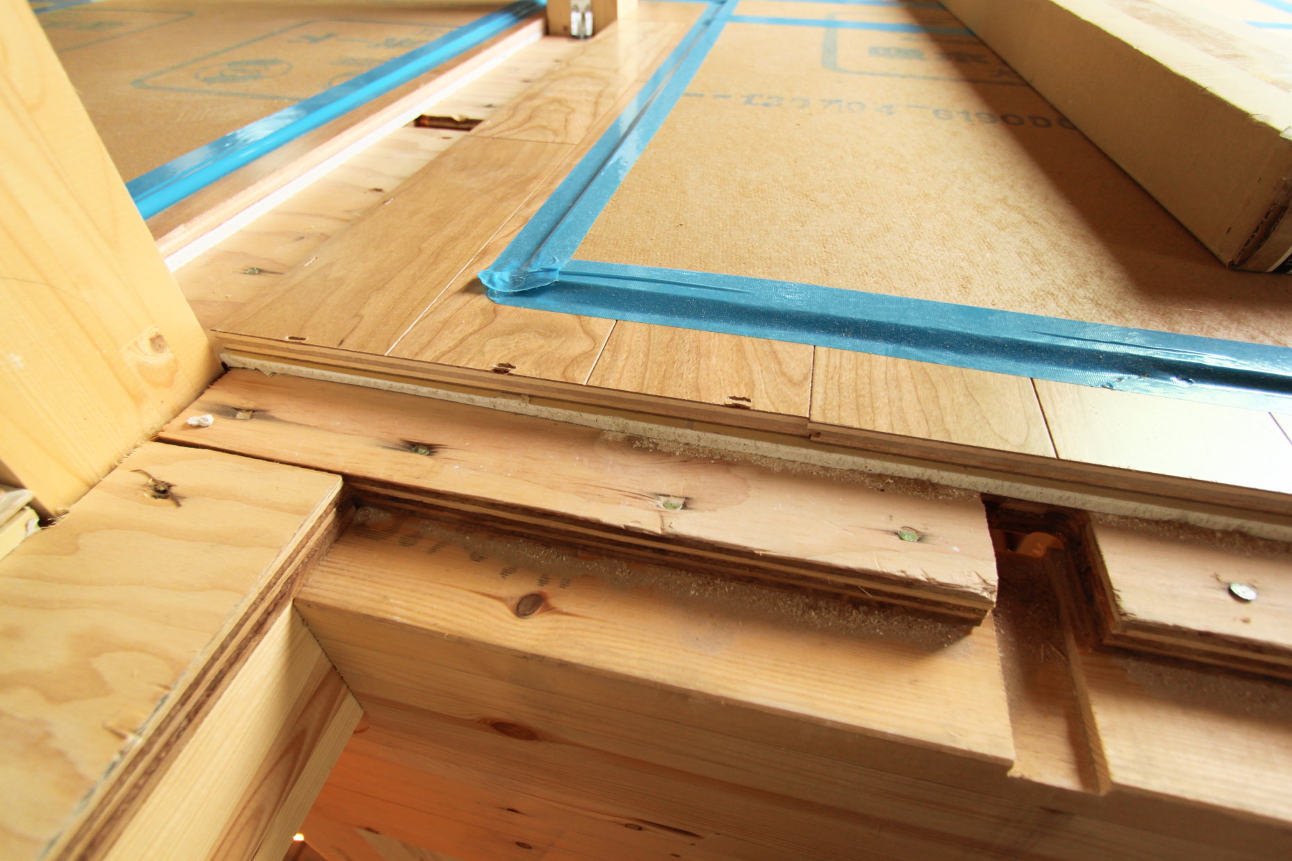 | 剛性・遮音性を高める為 構造用合板→プラスターボード→フローリングの3層構造 |